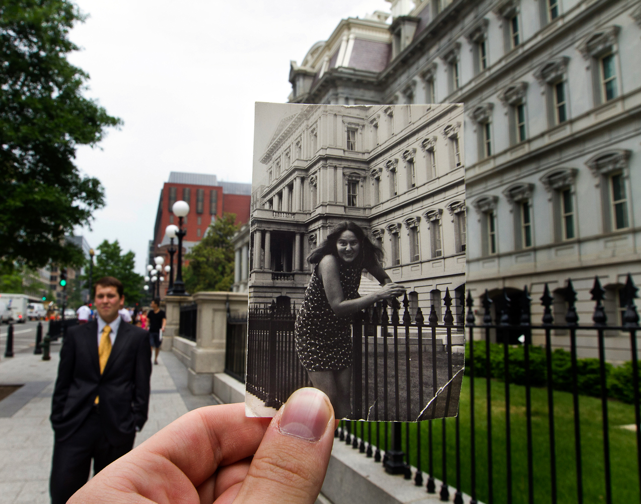 The above mentioned article talks about a website: Dear Photograph, the premise of which is to take new photograph holding an old snapshot in front of the scene where it was originally taken. Taylor Jones began the website when he was looking through old photographs with his family, he picked up a photo of his brother as a toddler and realised that his brother was sitting in the exact spot of the original photograph. A website was born!