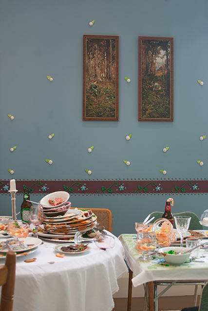 The collective Hotham Street Ladies commandeered the entire entrance of the The Ian Potter Centre: NGV Australia. Their three big installations, At home with the Hotham Street ladies were domestic scenes embellished with details made of icing. There was a chaotic table of leftovers, a hall rug with shoes and mail casually laid out, and a living room with couch cushions and ‘knitted’ afghans, books and paintings all made from icing.