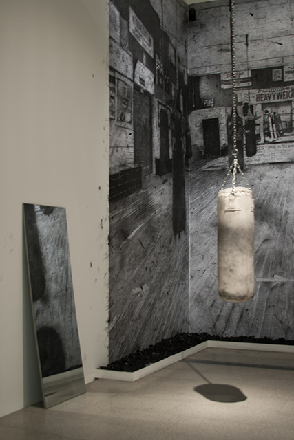 Richard Lewer‘s work was North Side Boxing Gym (2013) which consisted of a huge charcoal drawing, mirrors, a hanging punching bag and a recording of a training session. It was immersive because of the scale of the work, the way the mirrors caught the drawing and installation, and the sound that transports the viewer into the gym, but it was also somewhat disconcerting, because for all the sound and imagery, the lack of movement made the work quite eerie, as though I was somehow experiencing the ghost of a real occurrence.
