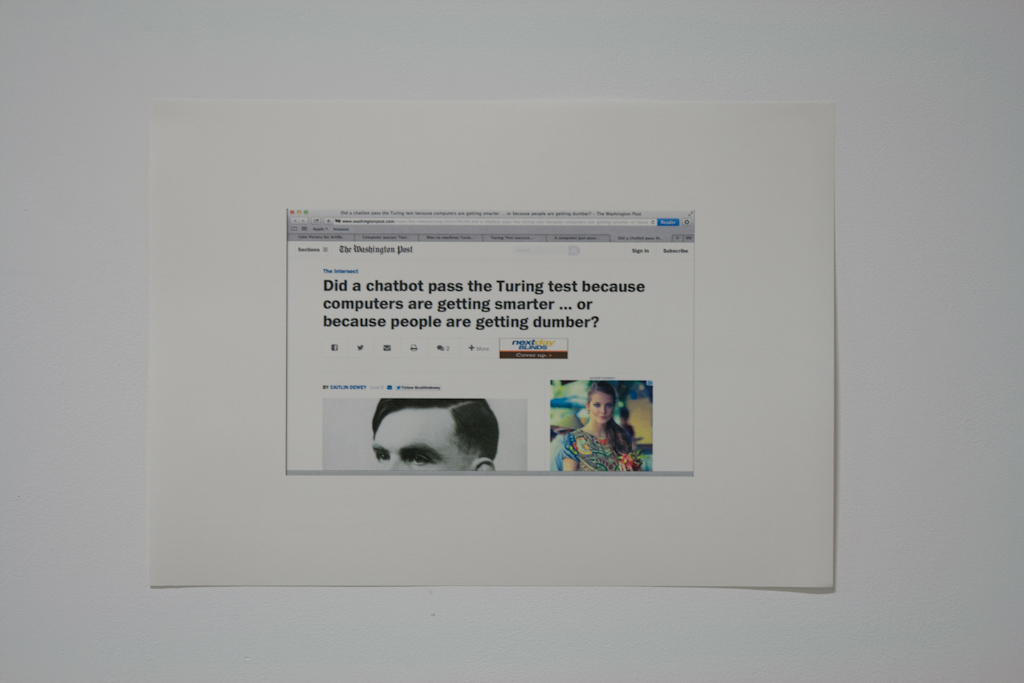 Justine Giles, 2014. June 2014, Turing test beaten? [screen-shot print on paper, 420 x 297mm]