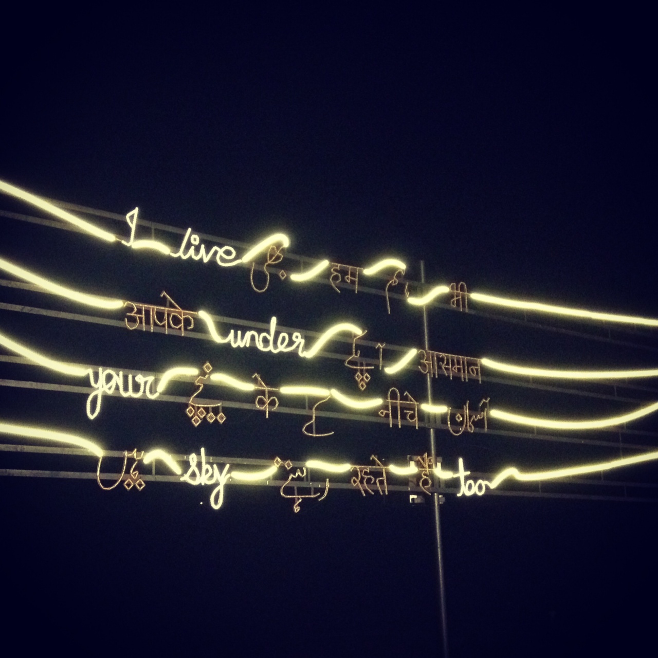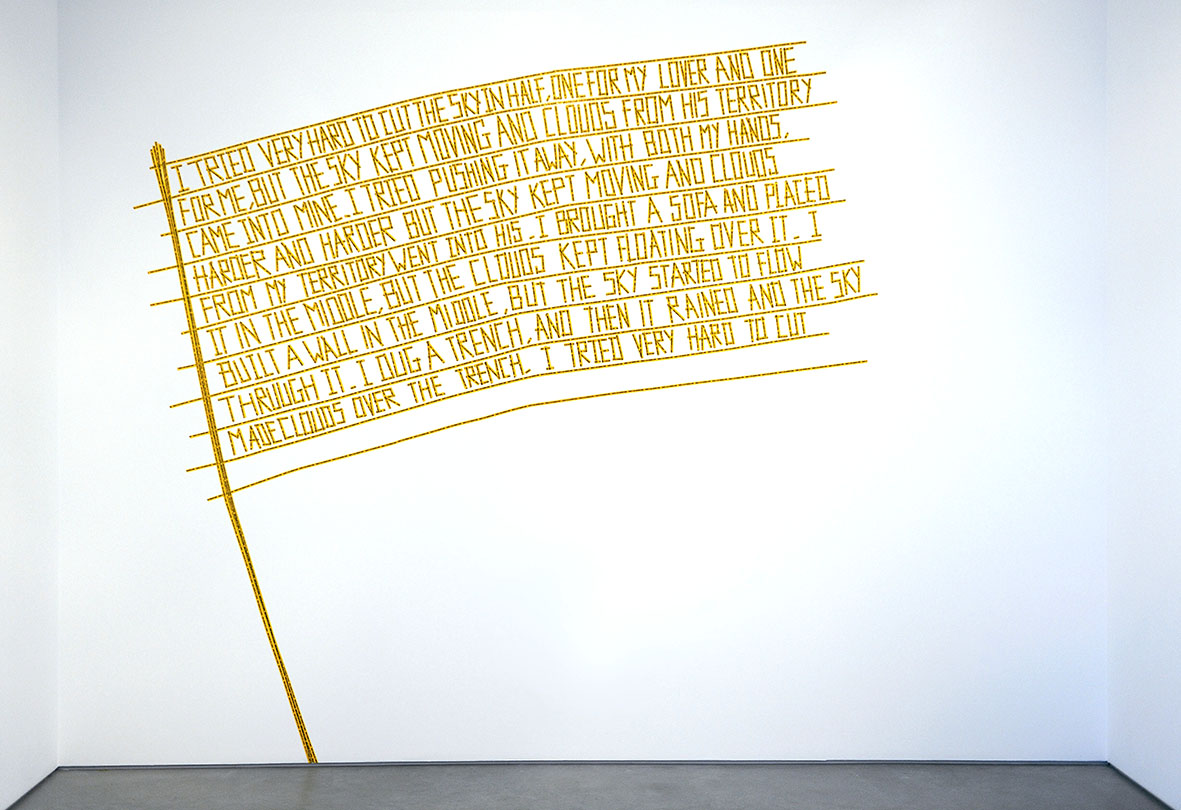 Shilpa Gupta 3 October 2, 2014 Written by justinegiles Shilpa Gupta, 2013. I live under your sky too. [Animated light installation, 975 x 488cm]. Bandra, India. Shilpa Gupta, 2005-2006. There is no border here. [Self-adhesive tapes, dimensions variable] Bristol, England: Bristol Museum and Art Gallery. Share this: Click to share on X (Opens in new window) X Click to share on Facebook (Opens in new window) Facebook Like Loading...