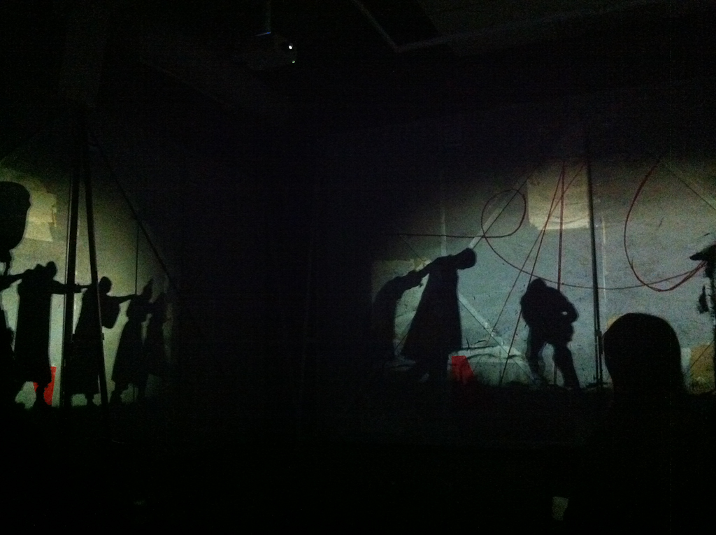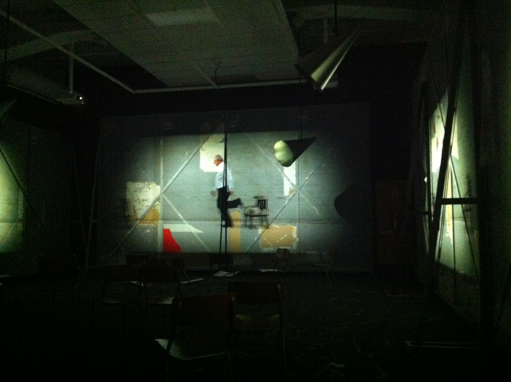 The Refusal of Time (2012) incorporates five video works that are projected on to the back of metal facings (criss-crossed with the metal struts and supports). These surfaces have the traces of paint, paper stuck on and ripped away, as well as irregular shapes cut from red card that have been taped on and left. The projected videos are linked but not identical, and are further interrupted and transformed by playing out across this patchy canvas that has been created for them.
