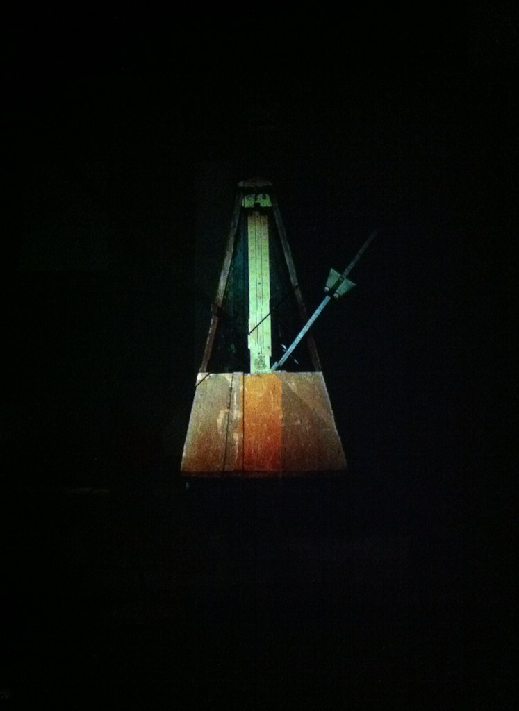It begins with five metronomes keeping time, until they don’t, and the consequent syncopation sets the scene for the duration, where the five screens alter between working in a series (movement happening across all screens in sequence, left to right, or outwards from the middle) to showing similar scenes slipping out of synch with each other creating the effect of moving forwards and backwards in time, or being stuck in a single moment replayed.