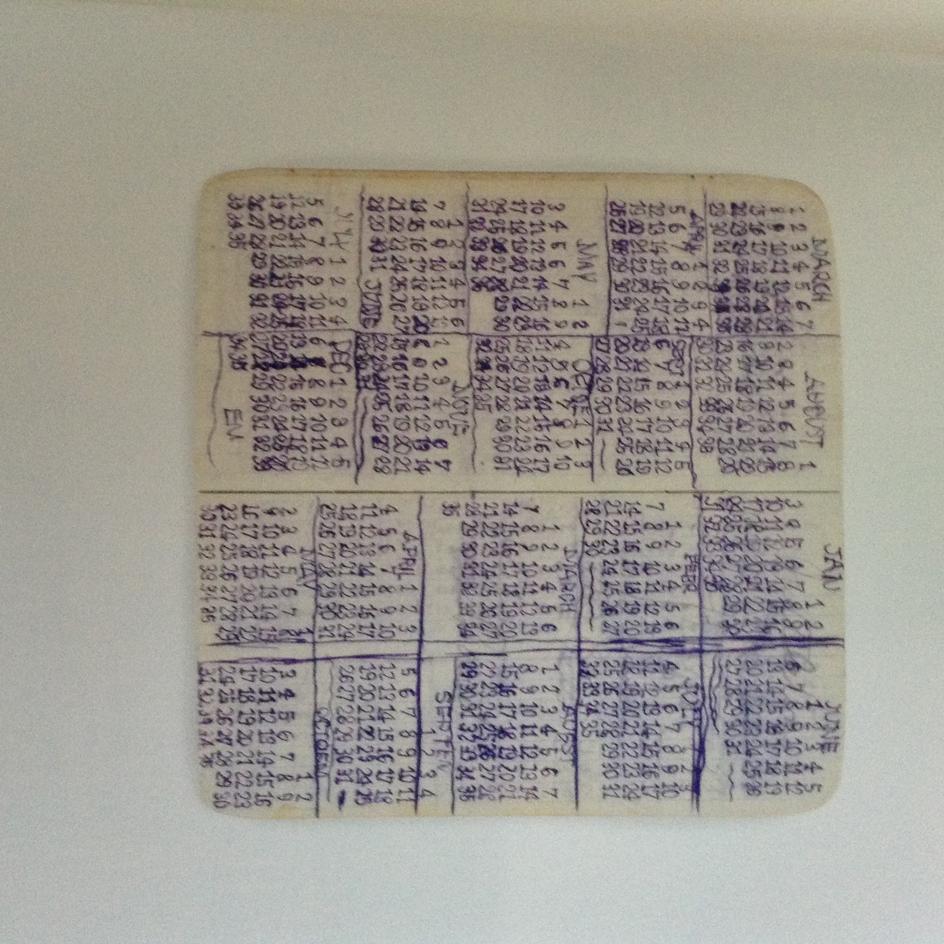 It appears that Castle considered the landscapes and interiors to be the public or shared part of his practice and the text works were more like private musings (Bell, 2014, p. 22). There is a strange notebook filled with an odd calendar, which starts out with recognisable months “… but these are quickly joined by murky abbreviations for new months, XERM, for example. Some months have thirty-one days but most have thirty-three, -four or -five days (always recorded in proper numerical order). About halfway through the notebook, numbers give way to months populated by letters, first in the same calendrical format, then in a reoriented, elastic grid, hinting at Castle’s effortless departure from the ordinary” (Bell, 2014, pp. 29 – 30).