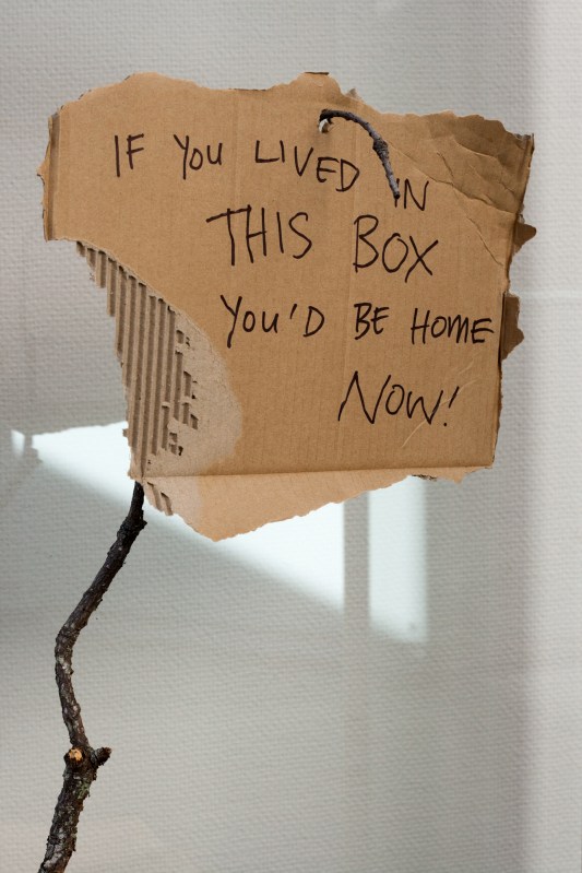 Justine Giles, 2015. If you lived in this box you’d be home now [cardboard, marker pen, stick]