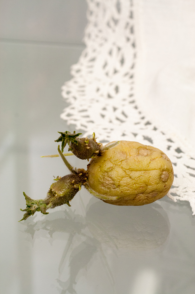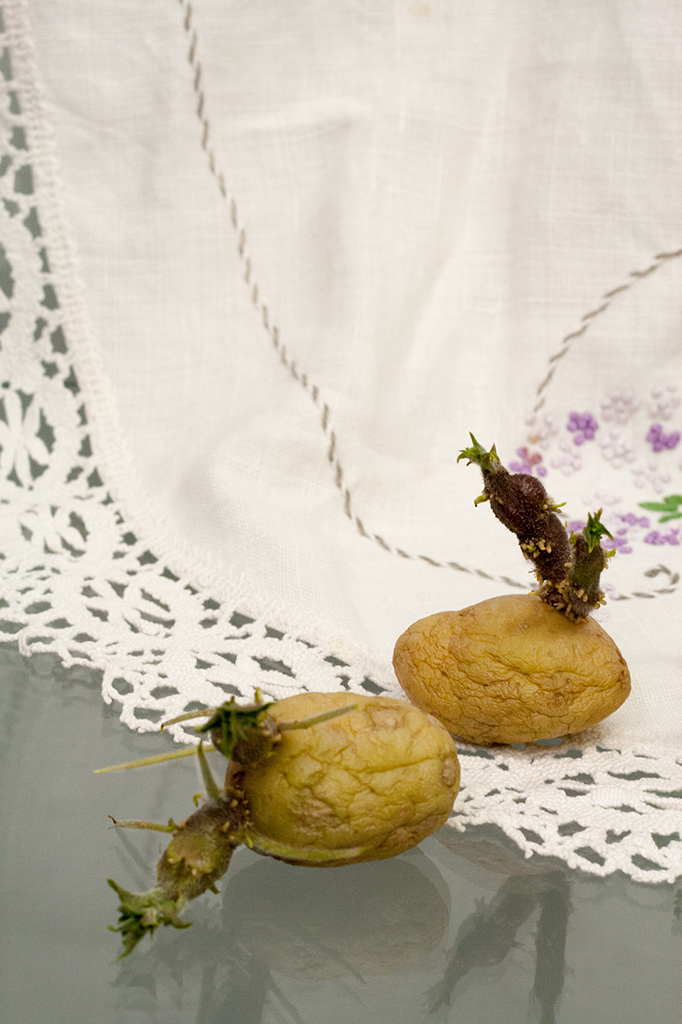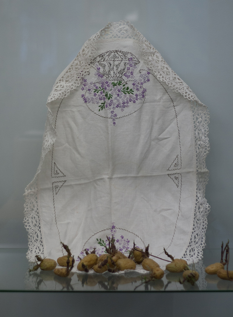 Justine Giles, 2015. The things we (never) leave behind [Nana’s embroidered table runner, sprouting potatoes, dimensions variable].