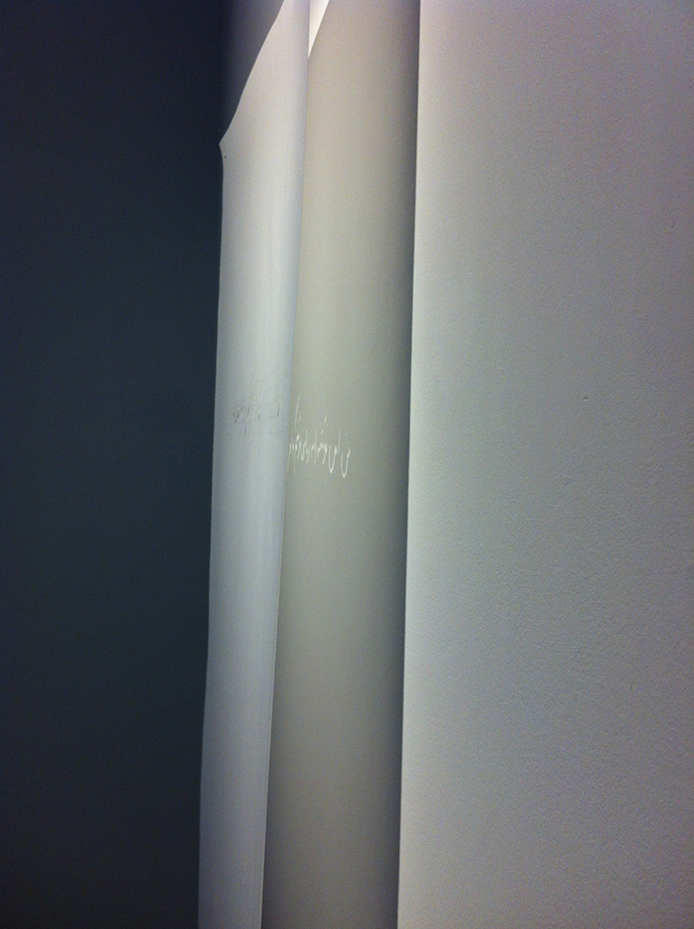 I feel like in this install it is finally complete. Positioned on a short end wall, it subtly invites a side view where the tonal shadow gives way to the writing that can be seen traced in light on the wall. This is how it always should have been shown: all it needed was a different perspective.
